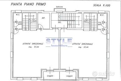 La soluzione è disposta su tre livelli. Al piano terra si trova un unico ufficio di oltre 130 mq mentre al piano primo si trovano due uffici di circa 65 mq l'uno insieme ad un ultimo piano mansardato di oltre 50 mq. Tutte le soluzioni sono provviste di magazzini, ripostigli, antibagni e bagni.