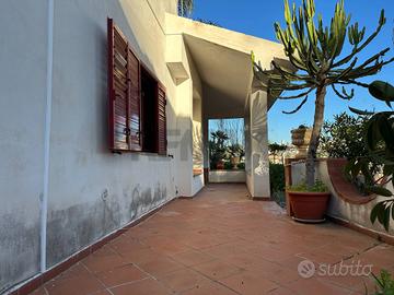 La villa è composta al piano terra da un'ampia veranda esterna, grande zona living, cucina e bagno; al piano primo da 2 camere da letto, 1 studio, terrazzo, balcone e bagno. L'immobile è all'interno di un lotto di terreno di circa 1000 metri e dispone anche di un comodo garage, 2 serbatoi con capienza totale di 10.000 litri per approvvigionamento di acqua, sistema di smaltimento liquami con fossa IMHOFF autorizzata, certificazione impianti idrico ed elettrico.