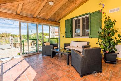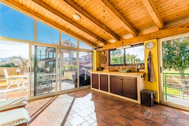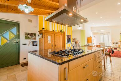 All'ingresso, vi accoglierà un ampio spazio living con cucina a isola, un generoso soggiorno con camino, un comodo bagno di servizio e due camere da letto. La veranda, dotata di chiusure in vetro, si affaccia sul curatissimo giardino e presenta una cucina esterna in muratura, aggiungendo un tocco di eleganza e praticità.