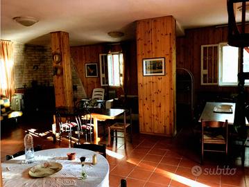 o Un salone generoso con un grande camino e calde finiture in perlinato, per un'atmosfera signorile e senza tempo.