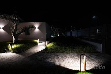 L'ampio giardino consente di realizzare una piscina a sfioro (a parte dal prezzo, con spiaggetta immersa nell'acqua, gradinata per accedervi, solarium piastrellato ed illuminazione notturna). I piacevoli porticati consentono deliziosi momenti di relax all'aperto.