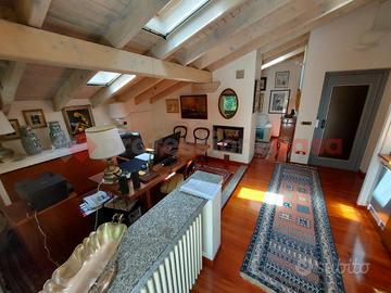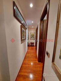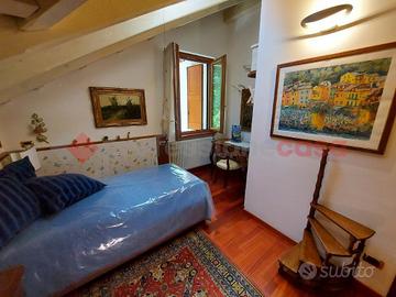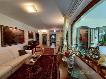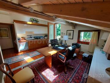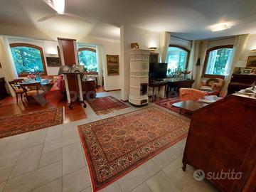 Al piano superiore e cioè a piano terra, con ingressi e vista sul fronte del parco, è stato realizzato l'appartamento principale, con grandi vetrate ed una splendida veranda totalmente apribile e destinata all'ingresso principale della villa. Si compone di un grande ingresso a vetrate, sala da pranzo collegata con l'ampio salotto e la grande cucina abitabile con apertura sul fronte del parco, due camere da letto con i rispettivi bagni, un locale destinato a studiolo con un'unica grande vetrata sul bosco. All'esterno sul lato destro della villa, una scala immersa nel verde conduce all'ultimo piano mansardato, composto dal terzo appartamento dove troviamo un'ampia cucina abitabile, salotto, uno spazioso studio, due ampie camere da letto con bagno e con balconi con vista sui sottostanti parco e bosco. Numerosi velux sul tetto contribuiscono ad illuminare tutte le stanze del piano superiore. L'intera struttura è anche munita di un comodissimo ascensore.