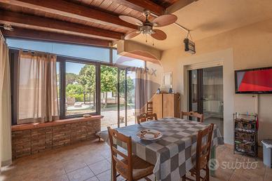 Rif: 30721501-161 Classe energetica: C Santo Pietro - Caltagirone Villa con giardino privato e angolo relax con Jacuzzi Su un unico livello, con mansarda, taverna e box auto Il piano terra è composto da una cucina soggiorno open space, due camere da letto e un bagno, e una cucina rustica in veranda chiusa. Il piano mansardato è dedicato interamente ad una camera da letto. Al piano seminterrato oltre alla taverna con uno spazioso living, un bagno e una camera da letto, un garage chiuso per un posto auto. Gli spazi esterni, caratterizzati da aiuole fiorite, piante ornamentali, alberi d'ulivo e un piccolo orto, constano di 9000 metri quadri circa. A completare la proprietà, un casotto di servizio, una tettoia per due posti auto, angolo barbecue e un favoloso angolo con Jacuzzi e un piccolo solarium, ideale per godersi tutte le stagioni della Sicilia. Venduta interamente ammobiliata Infissi a Taglio Termico Tapparelle elettriche e zanzariere Pannelli solari per approvvigionamento energetico con 2 batterie di accumulo. Illuminazione e videosorveglianza esterna Pozzo d'acqua sorgiva, cisterna da 20.000 litri e vari punti d'acqua per irrigazione Recinzione esterna e cancello automatico Costruita con cunicolo perimetrale