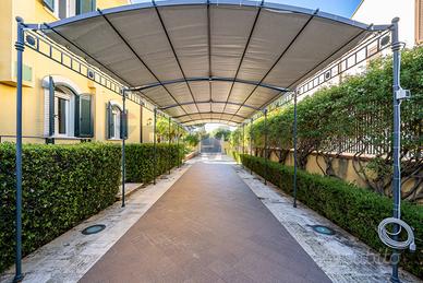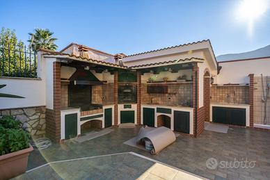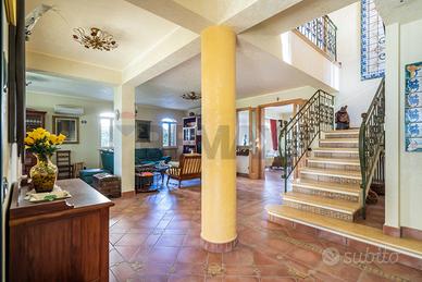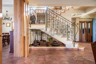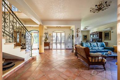 Costruita su due livelli, dotata di ingresso pedonale e ingresso carrabile, giardino curatissimo con lussureggianti piante mediterranee e rigogliose palme, sontuoso portico dingresso, ampio portico nel retro prospetto con area barbecue e forno, locale tecnico, area dedicata ad un piccolo e graziosissimo orto, cantina vini professionale, box e tettoia sul viale carrabile per posti auto e moto coperti.