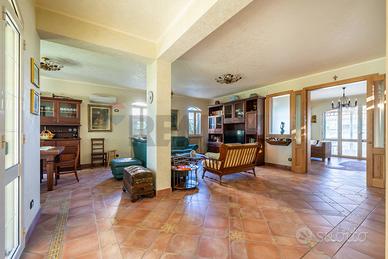La villa è composta al piano terra da un elegante salone di circa 60 mq., a seguire ampio e luminoso living con camino e grandi vetrate a giorno che guardano il portico presente nel retro prospetto, ampia cucina con annessa utilissima dispensa, una camera adibita a studio, una camera per gli ospiti e un servizio con doccia.
