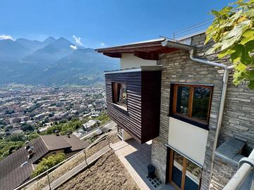 Una residenza incastonata nella collina piu' richiesta e suggestiva di Aosta. Ad oggi la villa di oltre 300 mq divisa in due unità abitative o villa unifamiliare12, ideale per due famiglie, ospiti o attività ricettiva.Si ha la possibilità di realizzzare un monolocale di servizio al secondo livello, un seminterrato di 200 mq da utilizzare secondo le proprie esigenze. Legno, pietra e acciaio si fondono in un equilibrio armonico, in un contesto ivaso da luce naturale da mattina a sera. Il tetto diventa un salotto a cielo aperto, un'oasi privata con un giardino panoramico. Riscaldamento autonomo a pompa di calore . La proprietà si completa con due garage e due posti auto esterni. La casa ideale per una famiglia che cerca ampi spazi, viste mozzafiato e privacy.