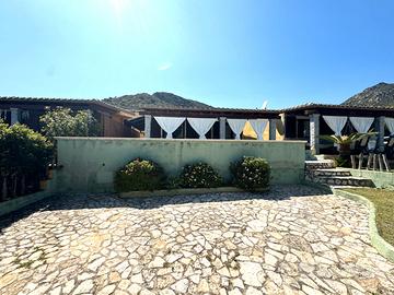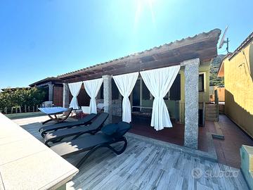 Posteggiata l'auto lungo strada o all'interno dell'area cortilizia privata, tramite qualche gradino si raggiunge un solarium lastricato su cui affaccia la spaziosa veranda coperta dalla quale si può godere di una discreta vista mare; lateralmente all'immobile sono presenti una doccia esterna e un barbecue.