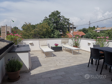 Al piano superiore corridoio con uscita alla grande terrazza, fornita di zona cottura su prezioso granito nero con lavello in acciaio e miscelatore con acqua calda e fredda (così come la doccia) e scala in ferro battuto che porta direttamente al giardino sul retro. Troviamo poi una stanza matrimoniale, più altra matrimoniale con bagno padronale completo di vasca idromassaggio angolare e doccia sauna, con accesso al sottotetto.