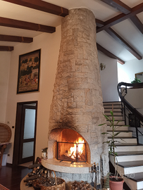 bussola in muratura con travi a vista ed armadio a specchio con uscita anche sotto il grande patio, salone open space con travi a vista e pavimento in panga panga (come tutte le stanze da letto), grande camino in pietra di Aurisina, importante scala d'arredo, cucina abitabile, bagno completo finestrato.