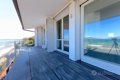 Al piano inferiore, raggiungibile sia con la scala che con il comodo ascensore interno, si sviluppa una seconda zona living fuori terra, da cui si accede direttamente al giardino privato di circa 200 mq e alla spiaggia privata. Qui troviamo una gradevole taverna, una terza camera da letto e un bagno.
