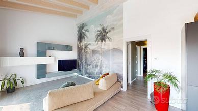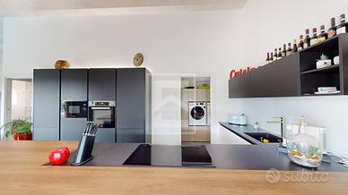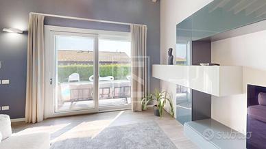 La zona living open accoglie il salotto e la cucina godibili anche dal giardino grazie alle ampie vetrate scorrevoli.