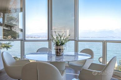 Il piano terra ospita una generosa living romm, attrezzata di cucina con arredamento da "barca" e un importante tavolo con pedana rotante per garantire ad ogni commensale l'esclusivita' di poter pasteggiare godendo dell'incantevole vista su Sirmione e sul golfo di Desenzano, affacciata completamente sul lago e sull'ampia terrazza per godere degli scenari suggestivi che il lago regala a seconda dei momenti della giornata; il bagno di cortesia completa il piano.