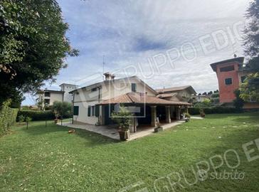 Villetta unifamiliare con ampio giardino privato di 1400 mq circa che si sviluppa su un piano fuori terra, più il piano ammezzato, il sottotetto e il piano interrato. In lato nord è presente il portico dingresso con copertura in legno e pilastri con rivestimento in pietra. Al piano terra trova collocazione la zona pranzo ed il soggiorno, la cucina, un bagno di servizio e una camera da letto. E presente anche un ampio portico in lato sud accessibile sia dalla zona giorno che dalla cucina. Tramite scala interna dalla zona giorno si accede sia al piano ammezzato, costituito da un vano adibito a camera, sia al piano sottotetto che accoglie la camera matrimoniale con bagno esclusivo, cabina armadio e balcone, una camera singola e altri tre vani adibiti a camera da letto, bagno e studio. Dalla zona giorno, sempre con scala interna, si accede ad un locale adibito a deposito/ ripostiglio, posizionato alla quota del giardino, e al piano interrato, dove trovano collocazione la taverna, la lavanderia e la centrale termica.