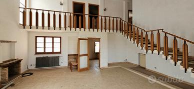 Edificata negli anni Ottanta, la proprietà si distingue per il suo carattere architettonico unico, con linee moderne e volumi che richiamano lo stile americano dell'epoca: tetto a doppia falda, grandi aperture, portico d'ingresso e un elegante salone a doppia altezza con camino e soppalco in legno, elementi che donano personalità e luminosità all'ambiente.