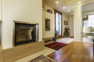 Ampia zona living open-space con camino di design e vetrate panoramiche che donano luminosità e continuità visiva con l'esterno.