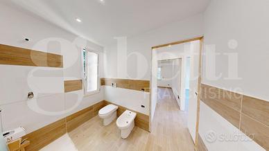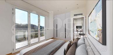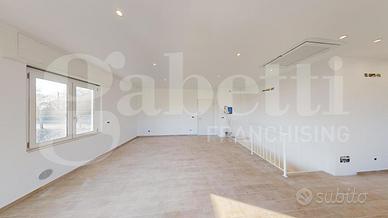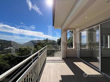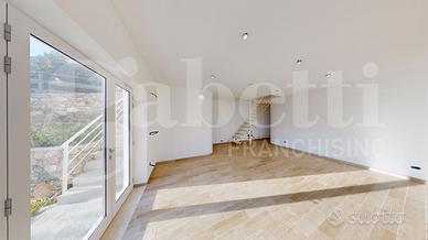 La soluzione è composta da: ingresso su un ampia zona giorno open-space con cucina a vista da cui si accede al terrazzo attraverso delle grandi vetrate che consentono alla soluzione di avere un' ottima luminosità durante l'arco dell'intera giornata e godersi a pieno la vista mare e le verdeggianti colline, doppio soggiorno al piano di sotto con accesso diretto al giardino, quattro camere da letto matrimoniali e tre bagni.
