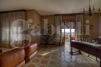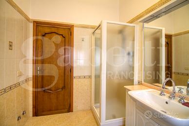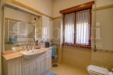 al piano primo, al quale si accede da una comoda ed elegante scala in marmo e rivestimenti in legno troviamo tre camere da letto e un grande salone di 45 mq. (a sua volta divisibile in altre due camere matrimoniali), un bagno, un balcone e un terrazzo di 60 mq. che gira su tre lati;