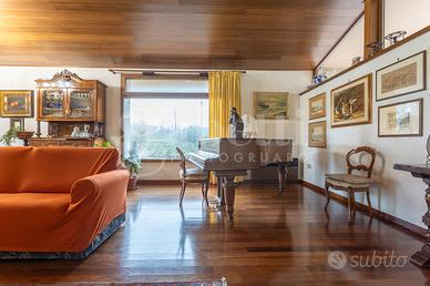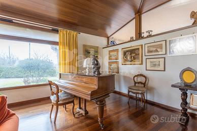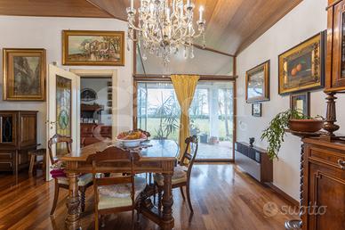 Circondata da un parco impreziosito da meravigliosi alberi di oltre 5000 mq e dotato di illuminazione, l'unità immobiliare si apre ai suoi ospiti con una grande e luminosa zona living di 60mq, caratterizzata dalla presenza di un caminetto con doppio affaccio a riscaldare l'ambiente. Si susseguono poi, la sala da pranzo comunicante con il giardino ed un bagno di servizio finestrato con doccia.