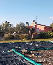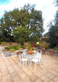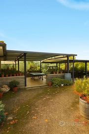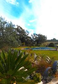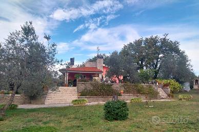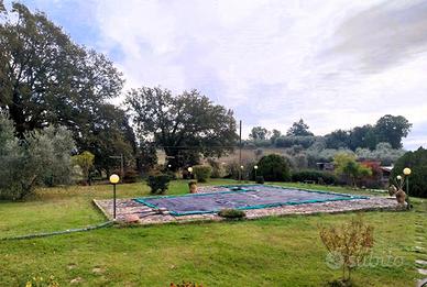All'esterno, la proprietà è circondata da 1 ettaro di giardino con ulivi e alberi da frutto, piscina di oltre 100 mq, 2 laghetti ornamentali, campo da bocce, box per cavalli, due porticati, 3 camini esterni ed ulteriore forno a legna. Completano la dotazione pannelli solari, un pozzo, una cisterna ed un impianto di irrigazione automatica a scomparsa.