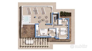 Villa A - Lussuosa villa con piscina. Vista Mare stupenda Elegante e raffinata villa con 2200 mq di giardino. Cod. 147 A- San Teodoro Località Suaredda La residenza LE VILLE SUARE' è ubicata a San Teodoro (SS), in loc. Suaredda di Supra, una splendida borgata alla periferia del centro abitato, che gode di una splendida vista sul mare, sullo stagno e sull'Isola di Tavolara, a diretto contatto con la natura e il verde rigoglioso circostante. Queste ville singole di nuova costruzione rappresentano la scelta ideale per chi cerca una casa esclusiva, moderna e con tutti i comfort. Situata in un contesto tranquillo e residenziale, la proprietà si sviluppa su due livelli e offre spazi ampi e luminosi. La location dista circa 2 km dalla rinomata spiaggia della CINTA, 2 km dal centro cittadino, inoltre a circa 20 km è possibile raggiungere l'Aeroporto e Porto di Olbia e circa 25 km per la Costa Smeralda. Sull'area in oggetto, è prevista la realizzazione di 3 ville esclusive, tutte con box auto doppio di 30 mq, con superficie commerciale di oltre 200 mq ciascuna, da realizzare complete di piscina interrata, rifiniture di alcune pareti in pietra granitica tipo giallo San Giacomo/Ovodda, recinzione del bordo lotto con pietra granitica locale, pavimenti effetto pietra naturale chiara, interazione domotica sui principali elementi della Villa, e altre finiture Luxury rispetto agli standard della zona. Caratteristiche principali: - Tre camere da letto matrimoniali, due con bagno in camera, molto spaziose , ideali per tutta la famiglia, con ampie finestre vetrate che garantiscono luminosità naturale. - Tre bagni di design, dotati di finiture moderne e funzionali, tutti finestrati. - Un'ampia zona giorno che si affaccia sulla veranda e piscina , perfetta per momenti di relax e per accogliere gli ospiti in un ambiente confortevole e raffinato. - Veranda e terrazza panoramica con vista mozzafiato sul mare, sullo stagno e sulla suggestiva isola di Tavolara, ideali per godersi una splendi