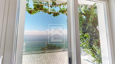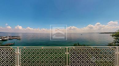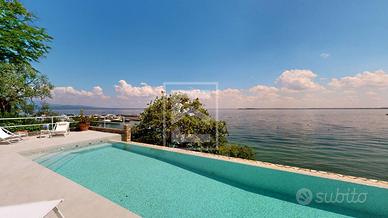 Il lato sud-est della casa, quello esposto verso il lago, è servito per la sua interezza da un ampio terrazzo da cui si domina il lago e da cui si può godere anche della vista della piscina e del porto retrostante.