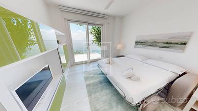 Nella splendida cornice di Manerba del Garda, appena sopra al porto di Dusano sorge Villa Flora, edificata negli anni 60 e completamente ristrutturata nel 2008/2009. Quando si entra ci si trova in un ampio soggiorno, da cui si ha una vista lago totale. Le ampie porte finestre, i colori chiari delle finiture e dell'arredo e l'orientamento della casa mettono ancora più in risalto le sfumature di azzurro e di verde che il cielo e il lago regalano agli ospiti di questa dimora. Il soggiorno è diviso in una zona salotto ed una zona lettura, dalla quale si accede alla zona pranzo ed alla cucina a vista, il tutto con vista lago pressochè da ogni punto. Accedendo alla zona notte si trovano sul lato sinistro il bagno principale e un guardaroba, gli unici locali senza vista, e una camera matrimoniale con terrazzino. sul lato destro del corridoio invece troviamo una camera doppia e una master room con bagno privato e cabina armadio.