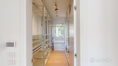 Al piano seminterrato c'è un loggiato, al termine dello scivolo, nel quale si possono far parcheggiare gli ospiti, dal quale si entra in un ampio garage in cui si possono comodamente parcheggiare quattro macchine. Dal garage si può salire verso il piano terra o accedere alla lavanderia ed ai locali tecnici. Sempre nel seminterrato, con accesso dal garage, si trovano altri due locali: una home spa con bagno turco, doccia e relax e uno studio o camera ospiti, anch'essa vista lago.