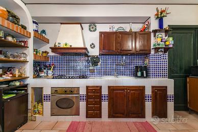 La cucina in muratura, funzionale e completamente attrezzata, è dotata di penisola per la colazione ed è collegata armoniosamente agli spazi del piano terra, dove troviamo inoltre due camere da letto e un bagno.