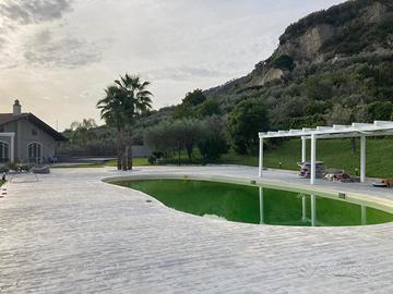 Il tutto circondato con 5000 mq ca di terreno di cui 2300 adibito a frutteto e 1800 mq pavimentato con piscina e parcheggio circostante. Ottime Rifiniture.