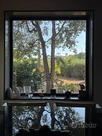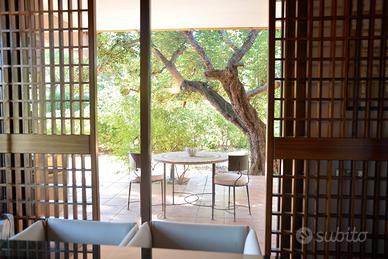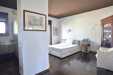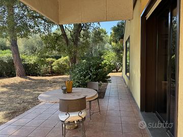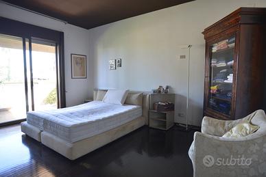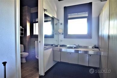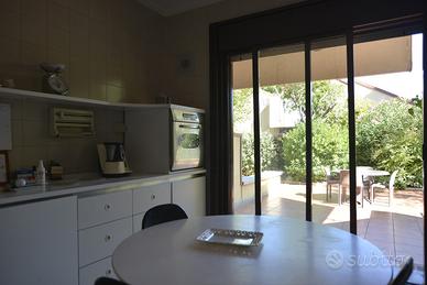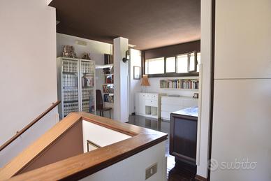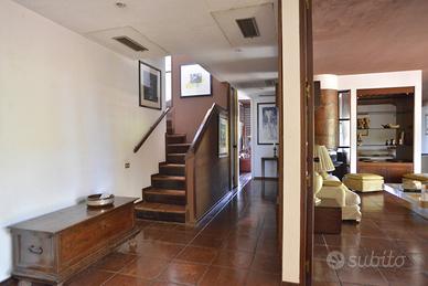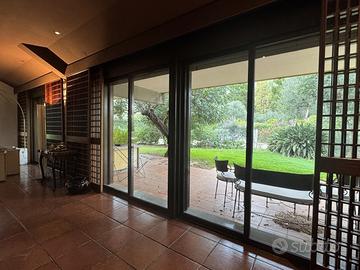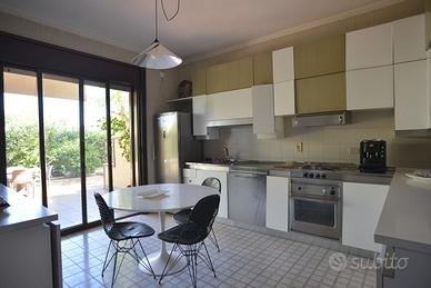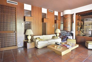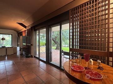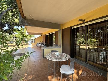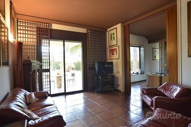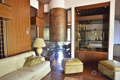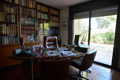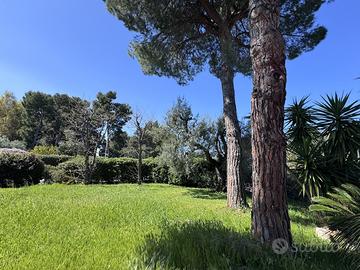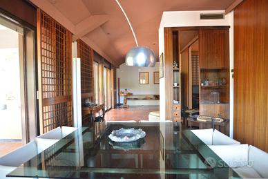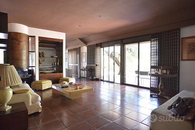 Nel prestigioso Complesso residenziale Parchitello, immerso nel verde, a pochi chilometri dal centro della città di Bari. Una grande villa di mq. 300 ca., su 2 superfici, circondata da un ampio giardino (mq. 1.500). L'immobile è caratterizzato da un taglio molto signorile e comodo, dagli ampi spazi arricchiti da ricercate soluzioni architettoniche, e da arredi fissi di ottima fattura. In casa ci accoglie subito un grande salone angolare, spalancato sul verde del giardino grazie ad una lunga serie di grandi vetrate, impreziosite dalle grate scorrevoli in legno, ripetute come elemento di design nella bellissima boiserie, realizzata nella medesima essenza, che caratterizza tutto il piano terra. Qui i toni del legno si fondono sapientemente con il calore del pavimento in cotto, con il rame del camino di design e con il colore dei soffitti. Nel grande salone una prima zona salotto con camino che continua naturalmente nei patii esterni, coperti, e termina in una sala pranzo angolare, sempre con vista sul giardino. Un'ampia porta scorrevole in legno, a tutt'altezza, ci separa dal soggiorno, più riservato, che ci garantisce ore di relax di fronte al verde. La cucina, ampia e funzionale, è affacciata con un'altra ampia vetrata sul retro della villa. Sullo stesso lato trovano posto anche uno studio con biblioteca, una camera da letto per gli ospiti con il proprio bagno, e una comoda zona lavanderia con bagno di servizio. Al piano superiore ci accoglie un grande disimpegno, illuminato da un lucernario e da lunghe finestre, che ci porta in tre ampie camere da letto, ognuna con il proprio bagno, tutte affacciate sui balconi che circondano la villa. Accanto all'ingresso di casa, una grande autorimessa (oltre 30 mq.) con comodi spazi di manovra esterni, che ha accesso diretto anche dall'interno; sul retro della rimessa, i locali tecnici. La villa è stata recentemente oggetto di un intervento di efficientamento energetico (cappotto termico sulle pareti e sul tetto,
