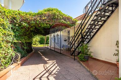 Ogni spazio è stato sapientemente concepito e distribuito per garantire il massimo del benessere e del relax, con ben 9 locali di cui due ampie zone di rappresentanza caratterizzate una dall'affaccio sul e curato giardino e l'altro sul ventilato e comodo porticato, 5 camere da letto, distribuite sui due livelli perfette per accogliere amici e familiari.