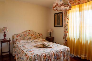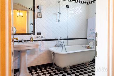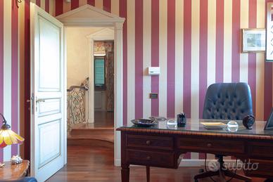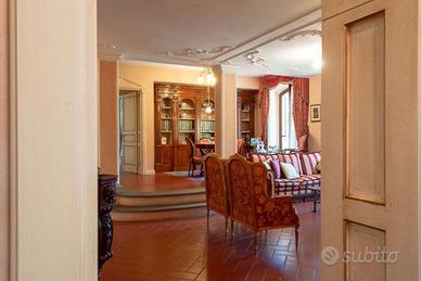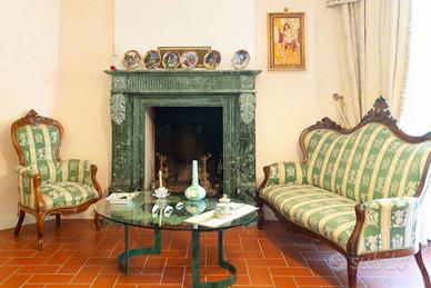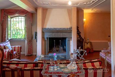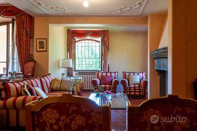 Si accede al piano primo dell'immobile da ingresso in ampio soggiorno su due livelli dove primeggia un grande camino in pietra. Dal soggiorno attraverso un piccolo disimpegno si accede alla sala da pranzo con camino in marmo verde, limitrofa alla cucina abitabile e al bagno di servizio. Ulteriori due camere matrimoniali e un ampio bagno completano il piano, una delle due camere si apre su un terrazzino privato con affaccio sul parco.