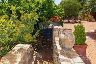 Spazio disponibile per eventuale piscina. I percorsi che attraversano il giardino sono lastricati con pietra dellEtna, gli spiazzi con pavimenti di cotto e inserti di pietra chiara.