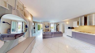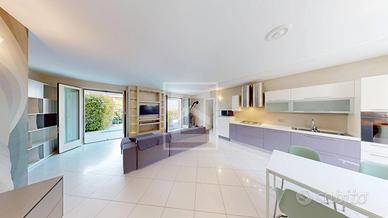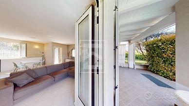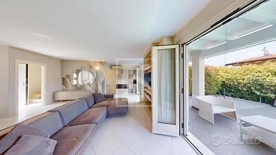 Realizzata su 2 livelli fuori terra oltre grande interrato, al piano terra troviamo un grande e luminoso living dotato di camino e di ampie vetrate che regalano grande luminosita' e consentono di accedere al giardino e alla piscina con porticato coperto vista lago; cucina a vista attrezzata, completa il piano un comodo bagno finestrato.