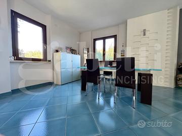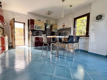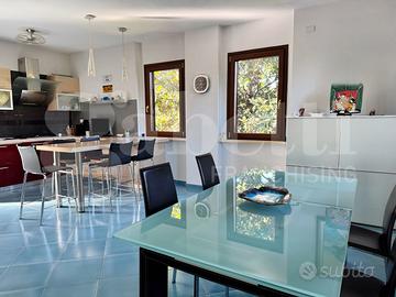 Entrando, la casa accoglie con un ampio soggiorno dai pavimenti in ceramica lucida, impreziositi da tonalità fresche e luminose. Gli infissi in legno con vetrocamera e le ampie finestre lasciano entrare luce naturale, creando un ambiente caldo e accogliente. La cucina, moderna e ben organizzata, è il cuore della zona giorno: uno spazio funzionale e perfetto per la famiglia o per intrattenere ospiti.