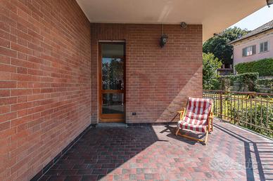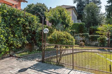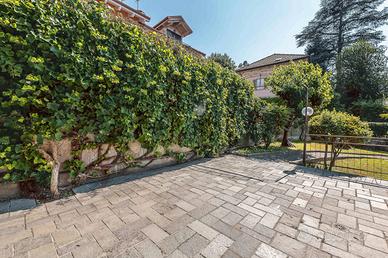 La villa è circondata dal giardino dai due lati, accessibile anche attraverso il terrazzo della cucina, e da un cortile pavimentato dal lato dell'ingresso.