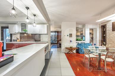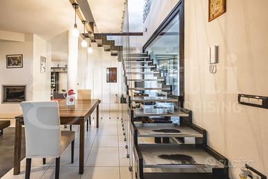 Al piano seminterrato ampio locale unico di 80 mq attualmente adibito a zona living con cucina a vista, disimpegno, camera singola, locale tecnico e bagno. Le ampie vetrate permettono di accedere all'ampio cortile con passo carraio.