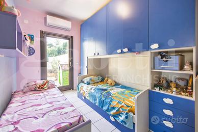 Il piano terra è composto da soggiorno con terrazzo a livello di oltre 33 mq, cucina abitabile con ampia dispensa, disimpegno, due camere singole, bagno e camera matrimoniale con bagno privato e veranda.