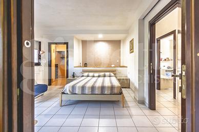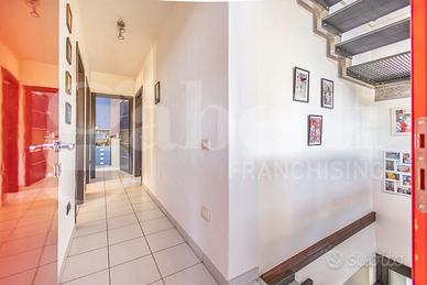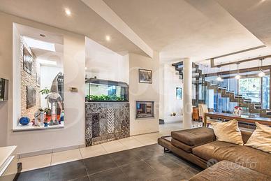 Al piano seminterrato ampio locale unico di 80 mq attualmente adibito a zona living con cucina a vista, disimpegno, camera singola, locale tecnico e bagno. Le ampie vetrate permettono di accedere all'ampio cortile con passo carraio.