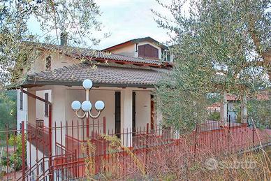 In posizione panoramica villa di complessivi mq. 265 di superficie abitabile distribuiti su tre livelli con garage e cantina di ulteriori mq. 130, terreno di pertinenza circostante di mq. 2500 recintato di cui parte a giardino con zone lastricate e parte a oliveto con 80 piante in età adulta, dispone di pozzo artesiano. Composta da: al P. seminterrato garage, cantina, c.t., bagno, ripostiglio, taverna, salone; al P. rialzato porticato esterno, salone con caminetto, sala da pranzo, cucinotto, disimpegno, 3 camere e bagno; al P. mansardato soggiorno-pranzo, disimpegno, 3 camere, bagno e soffitte praticabili ad uso ripostiglio. A.P.E. Classe energetica "G".