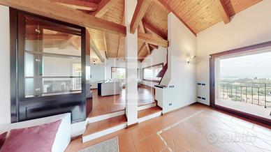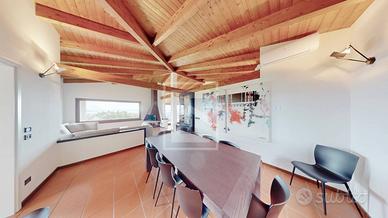 Al piano terra, un grande soggiorno con travi a vista e altezza di oltre 4 metri ci accoglie in un ambiente luminoso e arioso, articolato in zona ingresso, salotto con camino e zona pranzo, affacciato sullampio terrazzo panoramico. La cucina abitabile, il bagno di cortesia e un'elegante suite padronale con cabina armadio e bagno privato completano il livello.