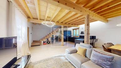 Al piano superiore, due ampie camere matrimoniali con alti soffitti in legno e affaccio su loggia coperta offrono atmosfera e privacy. Completa il livello uno studio, oggi elegante cabina armadio e un bagno completo finestrato.