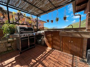 All'esterno, adiacente l'ingresso principale della villa, ci accoglie un grande porticato arredato con tavolo e sedie e organizzato con una cucina esterna corredata da un'area barbecue per momenti di assoluta convivialità all'aria aperta e al fresco in penombra.