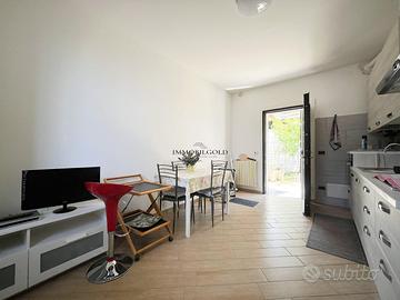 Piano terra: soggiorno con cucina a vista, camera matrimoniale e bagno.