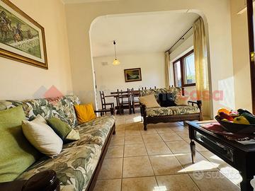 Proseguendo troviamo una comoda cucina attrezzata ed in muratura, con finestra e collegata tramite scala interna al garage sottostante. Procedendo oltre la cucina troviamo una stanza adibita a dispensa, con porta-finestra che ci conduce sul retro giardino e quindi direttamente alla veranda, inoltre presenta un bagno di servizio con angolo lavanderia e finestrone che rende tutti gli ambienti luminosi.