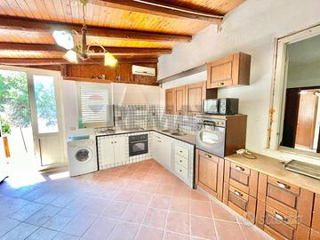 - Una cucina in muratura con tettoia in legno e ampia vetrata.