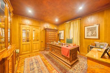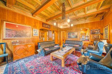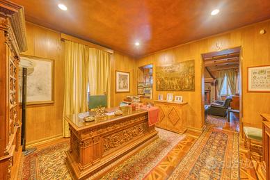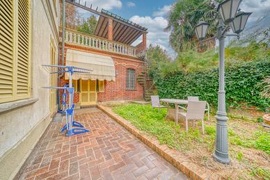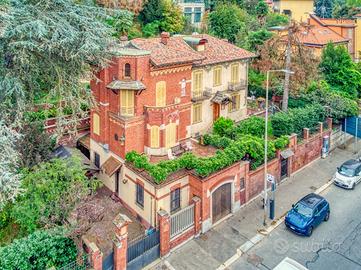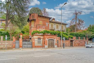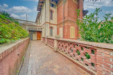 Storica dimora del 1902 in Art Nouveau (Arch. Sgarbi) splendidamente ampliata nel 1924 in puro stile eclettico dal famoso architetto Thermignon. La villa urbana, comodissima ai servizi, è circondata da terrazzi, cortili e giardini piantumati per un totale di 1.850 mq catastali e si sviluppa principalmente sul piano rialzato/primo, destinato a grandi sale contigue di soggiorno, pranzo, cucina, studi e zone di rappresentanza; il piano sovrastante notte è composto di una grande suite padronale con bagno e zona armadi, di altre tre camere e bagno; completa la proprietà un'ampia mansarda collegata con scala comoda, composta di due grandi locali, un bagno, due depositi; nella mansarda sono presenti una finestra angolare, due abbaini ed altre due finestre; infine, al piano seminterrato sono presenti un alloggio custode, l'autorimessa e vari locali cantinati. La casa è molto apprezzata per la facciata più antica decorata con delicati motivi floreali "liberty" in ammirevole contrappasso con il successivo "modernismo" dell'ampliamento in stile eclettico "Coppedè". La bellissima meridiana dipinta con il motto "Nullas numero nisi serenas" (... Conto solo le ore serene) compare sulla facciata del 1924 in adiacenza alla facciata liberty del 1902 e pare ammorbidire l'apparente contrasto di due bellissimi e diversi stili architettonici entrambi interpretati dai migliori autori. Il quadrante solare utilizza ore francesi prive di numerazione, tracciate su una finta tenda posta su una finta finestra e non ha funzione di misurazione del tempo ma semplicemente decorativa e artistica. La costruzione è stata realizzata con murature portanti in mattoni cotti e, soprattutto nella zona edificata nel 1924, con i primi solai in latero cemento, per cui si presta ad eventuali modifiche distributive. molte pareti sono ricoperte internamente di boiseries in legno pregiato con funzione isolante e di mascheratura delle invisibili grate scorrevoli di sicurezza, Si tratt
