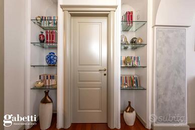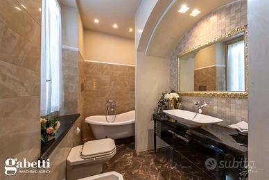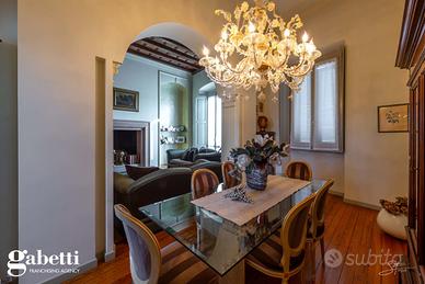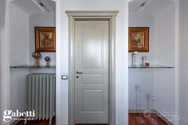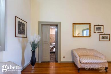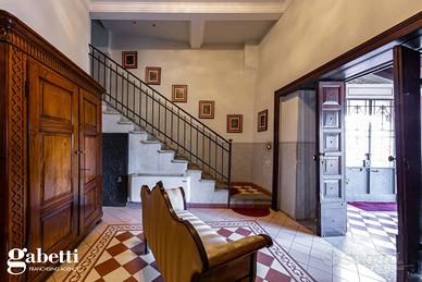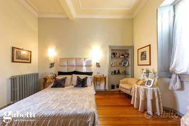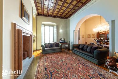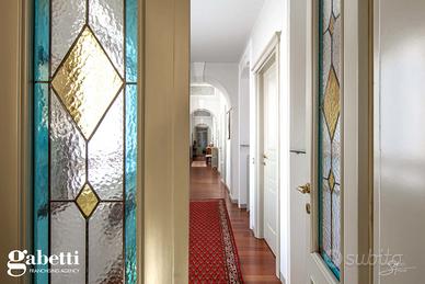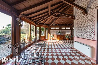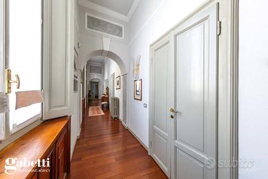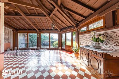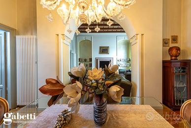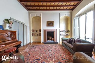 La proprietà immersa nel parco privato, si sviluppa su una superficie di 409 mq, distribuiti principalmente su unico livello al piano primo, oltre il caratteristico/storico ingresso dal piano terra. Al primo piano troviamo un luminoso soggiorno doppio con zona tinello pranzo, una grande cucina abitabile, doppi servizi, sono presenti tre spaziose camere da letto, un guardaroba, terrazzino immerso nel verde e caratteristica stanza tv.