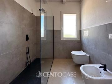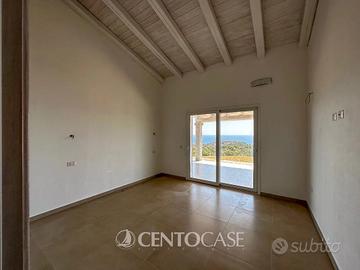 una villa dal design moderno con un ampia vetrata vista mare che introduce il soggiorno, tre camere, tre bagni e un ampia veranda coperta vista mare;
