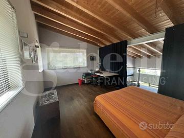 Una scala dal design particolare conduce al piano superiore, dove si trova un ambiente accogliente attualmente adibito a camera da letto, con bagno aggiuntivo.